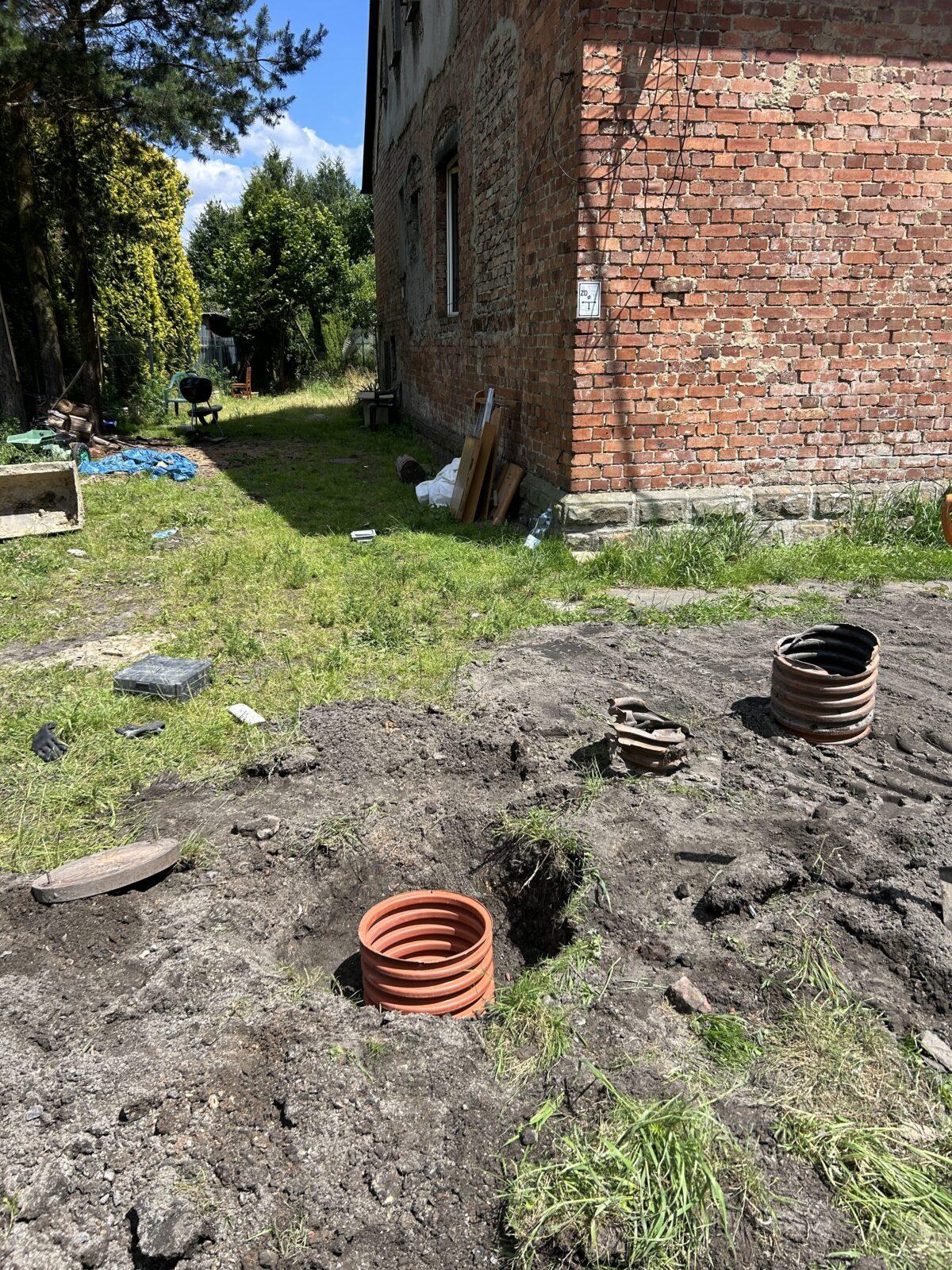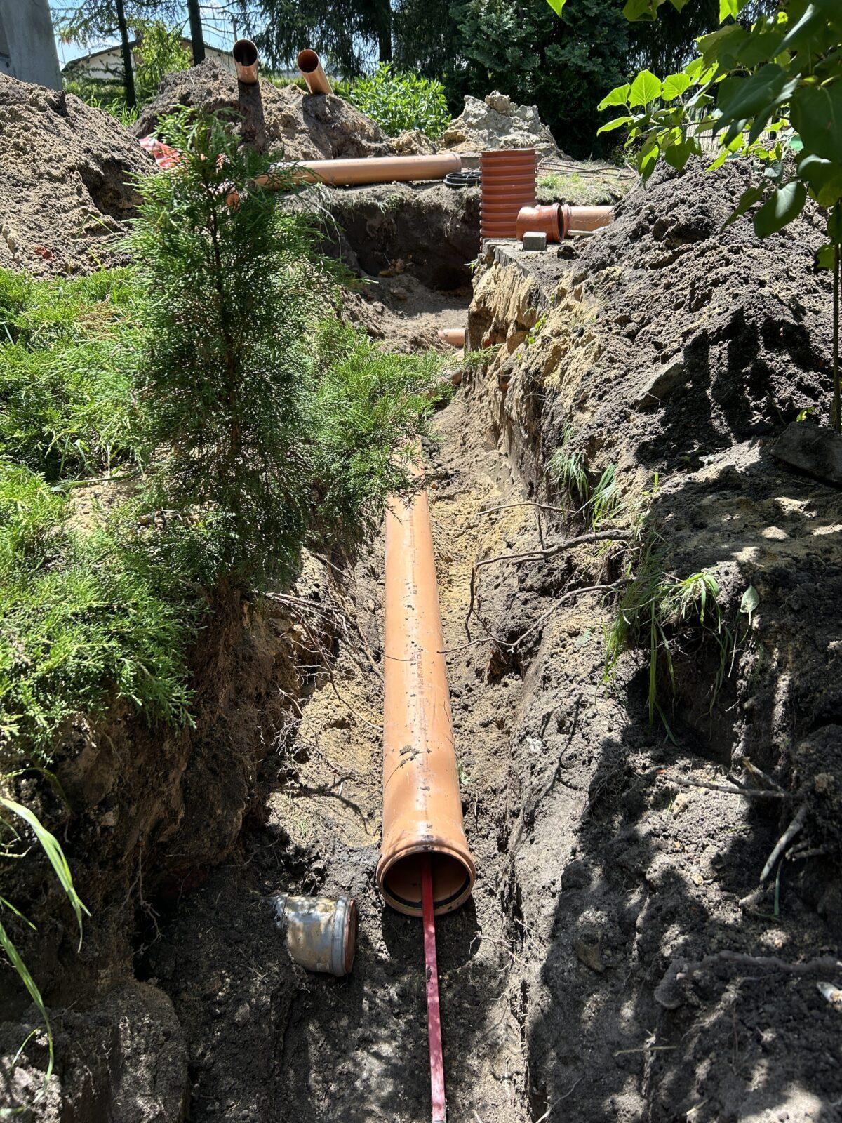 Ścieki oczyszczone rurą fi110 SN8 litą wpieliśmy do istniejącego wylotu w stronę rowu. Wymiana rury nie była potrzebna, ten odcinek był drożny.