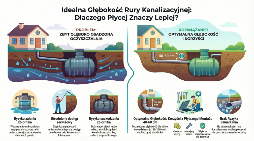 W przypadku oczyszczalni ścieków im płycej, tym lepiej – dostęp serwisowy jest łatwiejszy, a montaż mniej problematyczny. Z zagadnieniami praktycznego montażu dobrze łączy się artykuł „6 najczęstszych błędów przy montażu oczyszczalni przydomowej”.