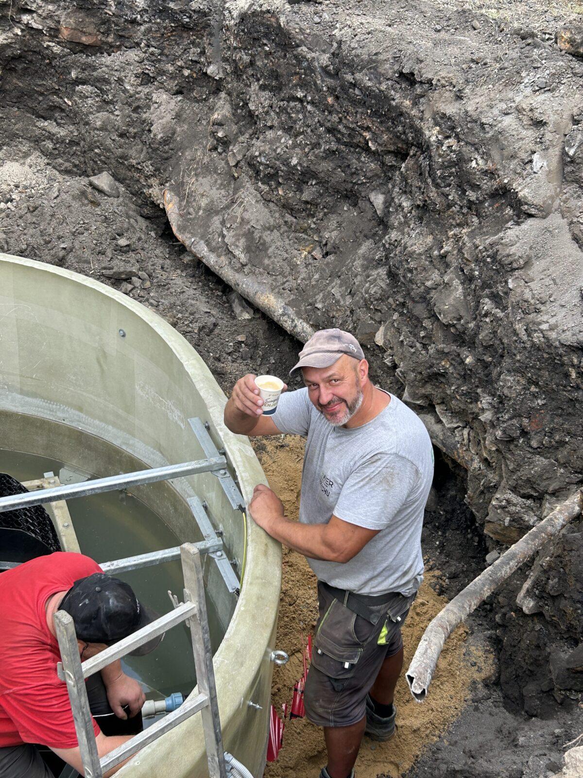 Na dnie wykopu, czyli na około 390 cm trafiliśmy na wodę gruntową, która nieco utrudniła nam osadzenie oczyszczalni. Po wykonaniu podstawy osadziliśmy oczyszczalnię, a następnie zalaliśmy wodą przy jednoczesnym obsypywaniu z zewnątrz.