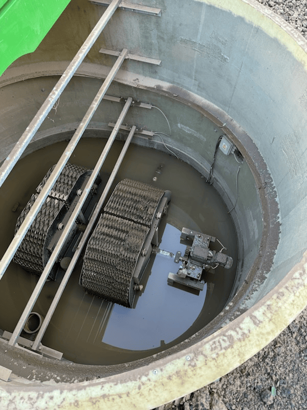 Odpływ ścieków oczyszczonych odbywa się z pomocą przepompowni. Rura idąca w stronę rzeki była wyżej, niż rura kanalizacyjna zatem nie było możliwe wpięcie grawitacyjne.